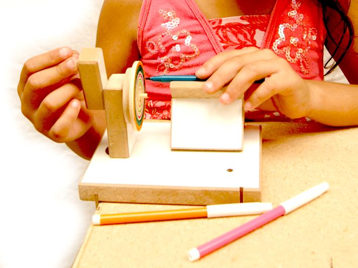 Acompanha caneta hidrocor que realça bem as cores para poder ver os efeitos com os piões em movimento.
