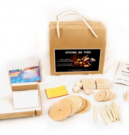 Um conjunto de peças para pintar, montar e brincar. É possível montar dez piões diferentes.